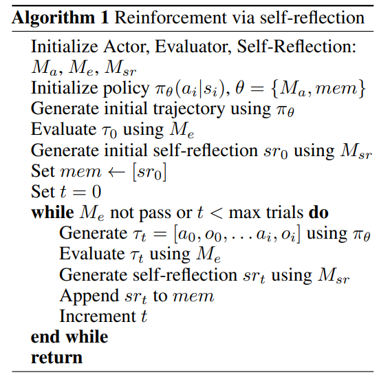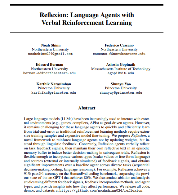 Reflexion: Language Agents with Verbal Reinforcement Learning 本文是由Northeastern University, Massachusetts Institute of Technology, Princeton University联合发表,主要通过反思的形式来提升 Agent 的决策能力。