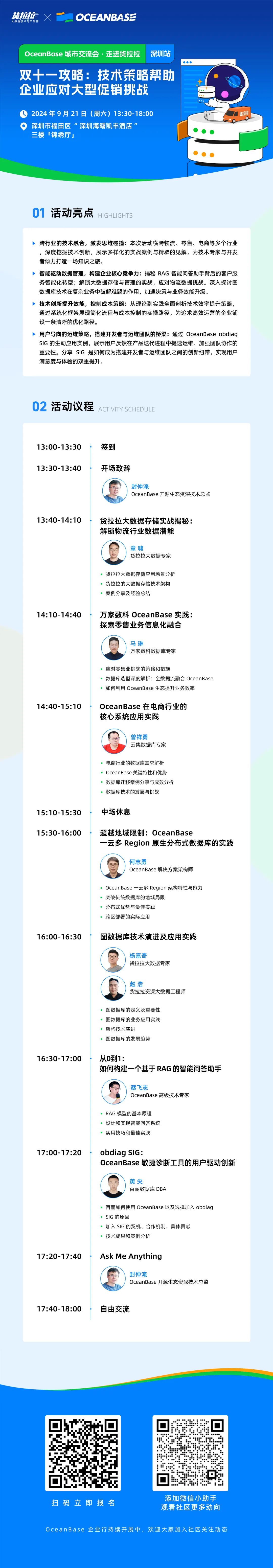 全新升级的“OceanBase 城市交流会”将于 9 月 21 日落地深圳站,携手货拉拉大数据技术与产品部门,共同打造以《双十一实战攻略:科技策略帮助企业应对大型促销挑战》为主题的线下会议。