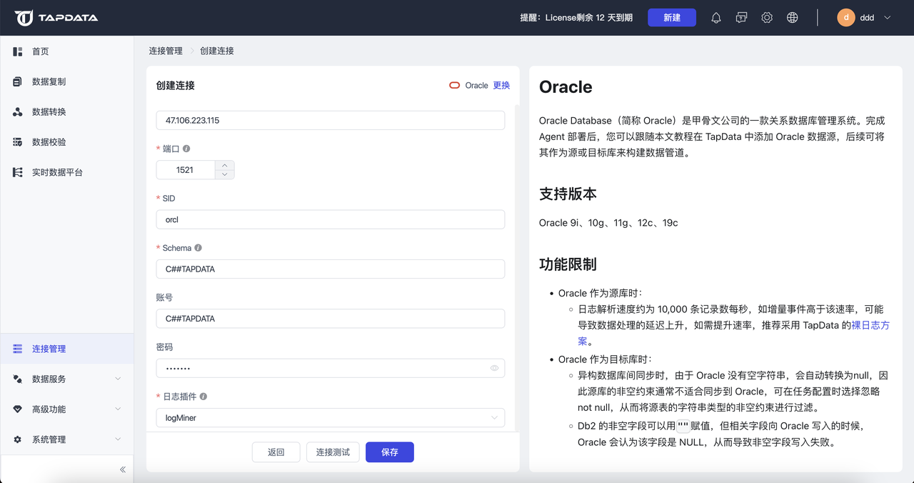 在跳转到的页面,根据下述说明填写 Oracle 连接信息: