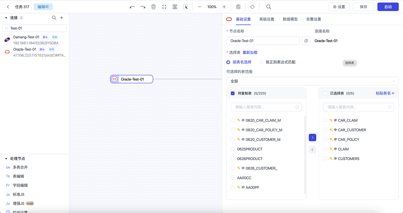 完成 TapData Agent 部署后,即可跟随以下教程在 TapData 中添加源与目标的数据连接(支持版本:Oracle 9i、10g、11g、12c、18c、19c+;DM 7.x、8.x),并快速构建数据管道。(*涉及工具版本为 TapData 本地部署版)