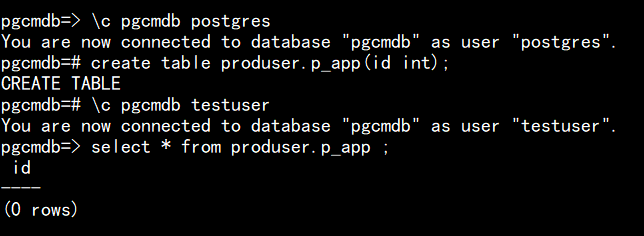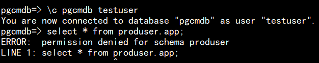 pgcmdb的owner是produser,并且有同名的produser模式,未授权前,testuser无法查看produser.app表,如下图