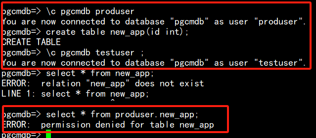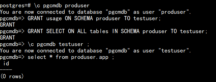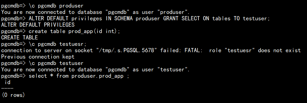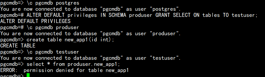 发现还是没有权限读取produser新建的表。经过验证测试,发现 想让testuser有权限读取produser新建的表,就必须以produser来执行ALTER DEFAULT privileges IN SCHEMA produser GRANT SELECT ON tables TO testuser;