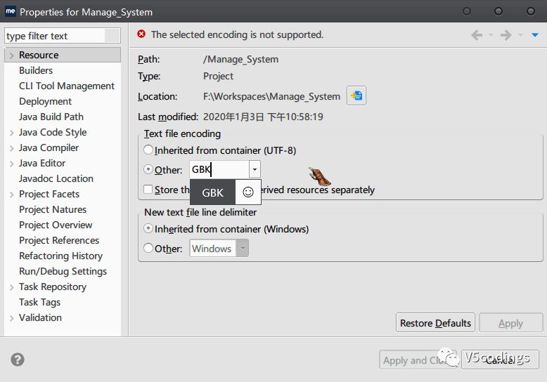 若MyEclipse 项目编码UTF8时乱码,调整成GBK,如果在下拉列表中没有GBK编码,可以直接输入GBK