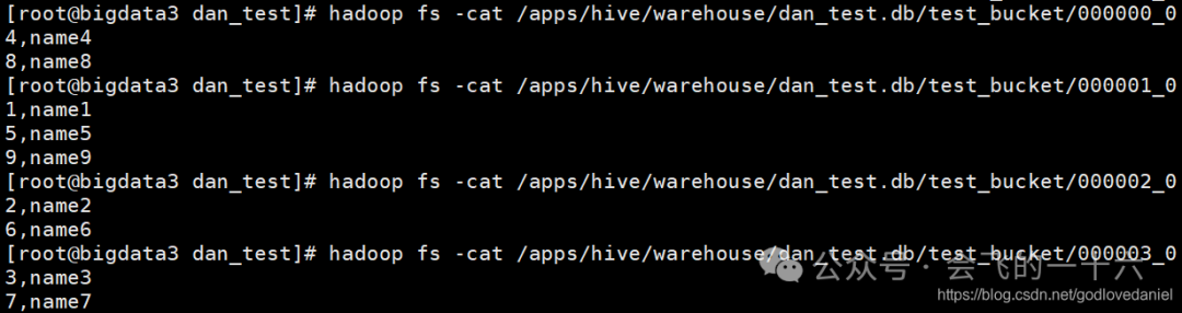 通过 clustered by(字段名) into bucket_num buckets 分桶,意思是根据字段名分成bucket_num个桶。drop table test_bucket;create table test_bucket (id int comment 'ID',name string comment '名字')comment '测试分桶'clustered by(id) into 4 bucketsROW FORMAT DELIMITED FIELDS TERMINATED BY ','location '/apps/hive/warehouse/dan_test.db/test_bucket';