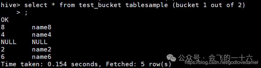 hive> select * from test tablesample (bucket 1 out of 2 on id);OK2 name28 name84 name46 name6