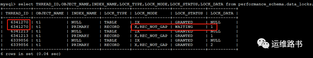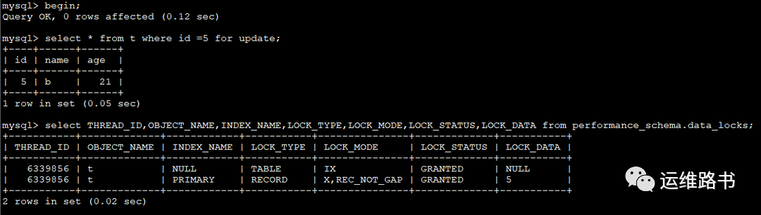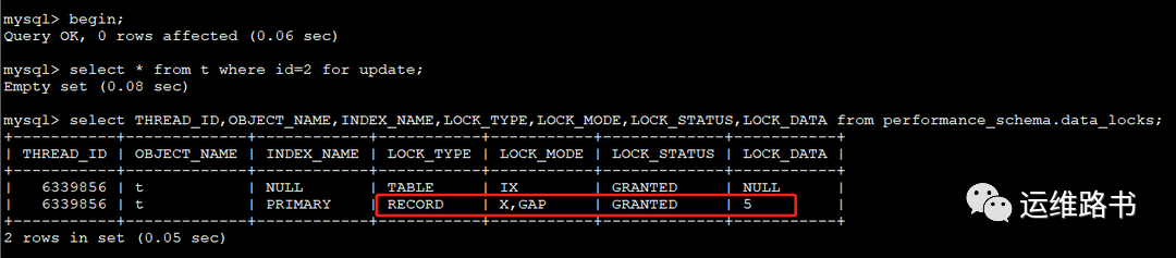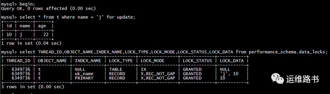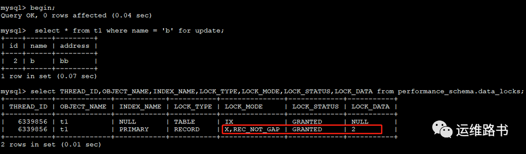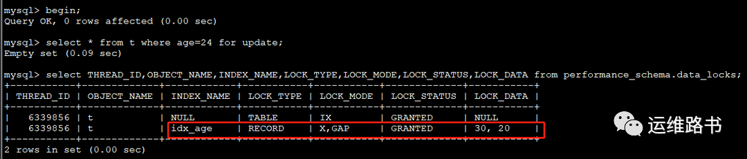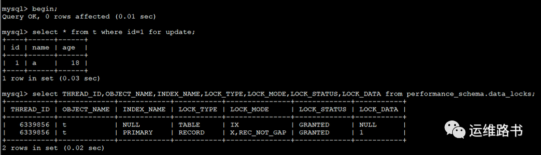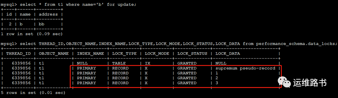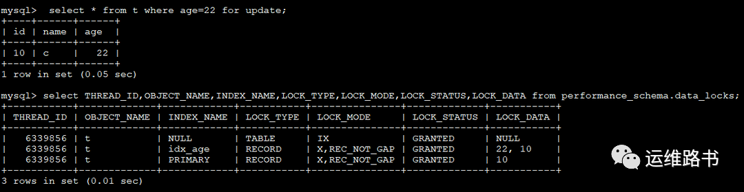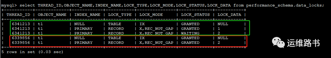 如图所示:通过THREAD_ID可以判断出绿色框为事务B,存在三把锁,除了意向排他锁以外。首先,扫描了id=1的记录并给主键加了记录锁。接下来,扫描id=2的数据,在准备对主键加锁时,出现了锁等待,因为事务A持有id=2的记录锁。