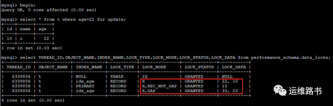 由于age=22这条记录存在,所以,id=10的主键也会加一把记录锁,以保证其他事务无法修改和删除id=10这条记录。