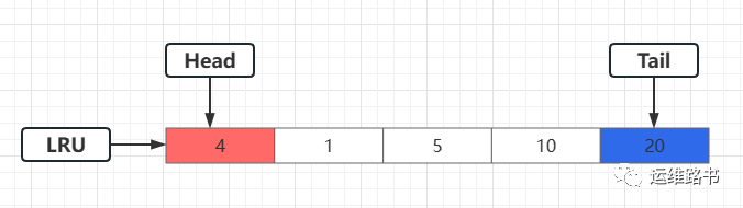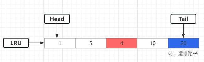 现在需要访问4号页,由于4号页已经在缓冲池中了,因此只需要将4号页移动到LRU的头部,尾部的页不会被淘汰。