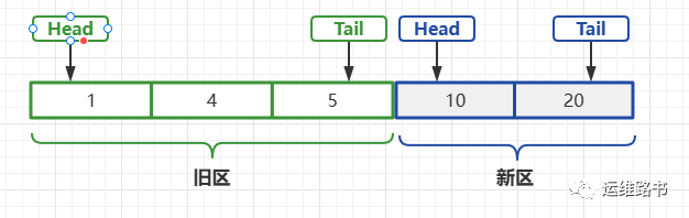 2)新区旧区首尾相连,新区的尾部连接旧区的头部。