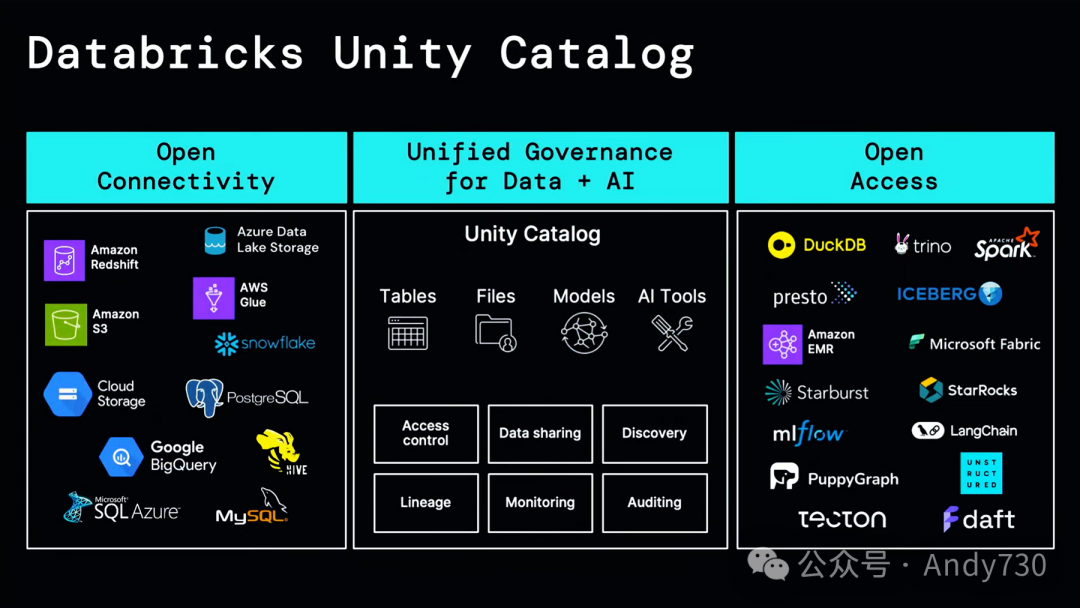 下图是Databricks上周在其年度大会上展示的,显示了Unity如何连接所有各异的数据平台、提供多种类型的数据和功能,以及对各种数据处理引擎的开放式访问。基本思想是将任何这些数据处理引擎带入数据环境,并由Unity进行管理。