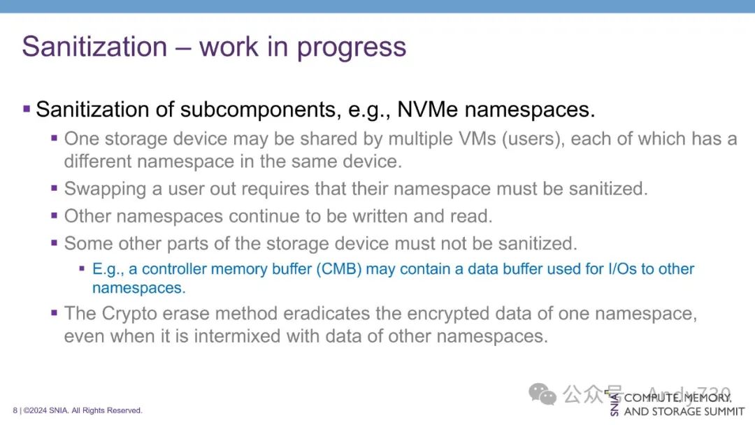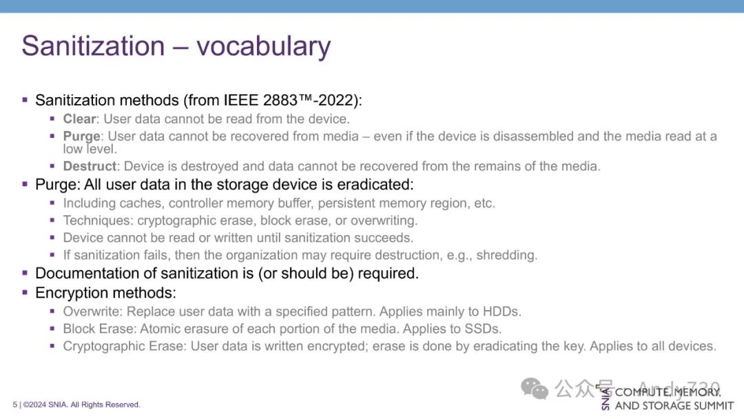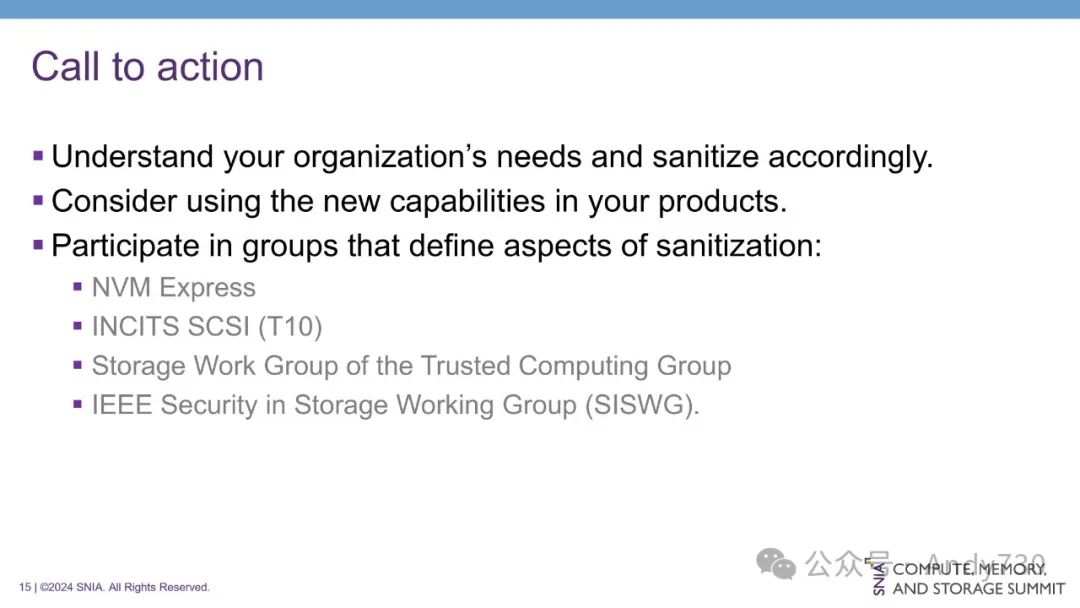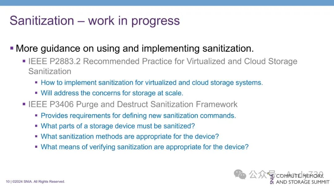 在IEEE SISWG中,还有一些正在进行的工作。其中一个是针对虚拟化和云存储销毁的推荐实践(2883.2)。它提供了关于在大规模系统中实施销毁的指导。P3406被称为“销毁和破坏销毁框架”。它提出了定义新销毁命令的要求,帮助确定需要销毁的设备部分、适用的销毁方法,以及应包含在销毁定义中的验证销毁的手段。我们希望这将被广泛采纳,而不仅仅是局限于像NVMe这样的定义其设备销毁方法的组织。