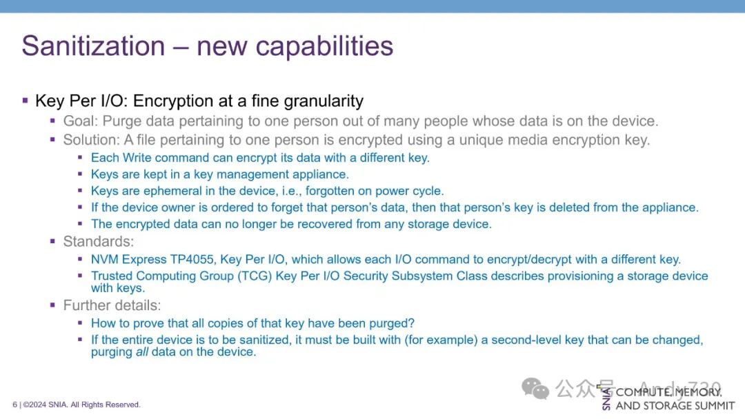 让我们来了解一下过去一年左右出现的一些新功能。首先是一种名为“Key Per I/O”的技术,旨在以非常细粒度的级别进行加密。例如,你可能会收到一项指令,要求从单个设备存储的众多用户数据中清除某个人的数据。解决方案是使用唯一的介质加密密钥加密属于一个人的文件,而使用不同的密钥加密属于其他人的文件。NVMe已经定义了实现这一目标的方法。每个写入命令可以指定不同的密钥来加密数据,同样,读取命令将指定相同的密钥来读取相同的数据。密钥不会存储在设备上,而是保存在密钥管理设备中。在设备内部,它们是暂时的。例如,在停电或电源循环时,密钥将被清除,必须重新加载。这意味着如果有人窃取设备并且设备失去电源,密钥将丢失,他们将无法解密该设备上的数据。
