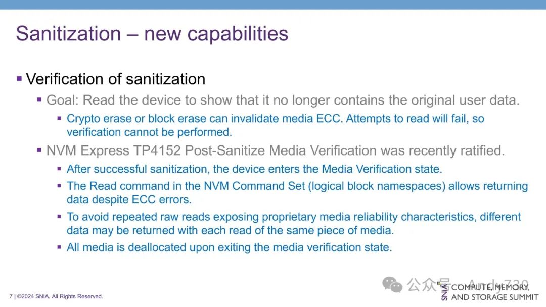 最近,NVM Express批准了技术提案4152,名为“销毁后介质验证”(Post-Sanitize Media Verification)。它的工作原理是:成功销毁后,设备会进入一种特定状态,即介质验证状态。此时,适用于使用逻辑块的命名空间的NVM命令集中的读取命令(这个版本的读取命令)将允许在ECC错误的情况下返回数据,这样我们就可以查看介质上的数据,并确认它不是最初写入的数据。
