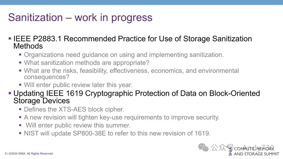 在标准方面,还有一些其他工作正在进行。其中两个项目在IEEE安全和存储工作组中进行。P2883.1被称为“存储销毁方法使用的推荐实践”(Recommended Practice for Use of Storage Sanitization Methods)。它基本上提供了如何使用标准2883的指导,帮助组织了解什么是适合他们数据的适当方法,以及这些方法的风险、可行性、有效性、经济性和环境后果。这个项目标准预计将在今年晚些时候进入公开审查阶段。