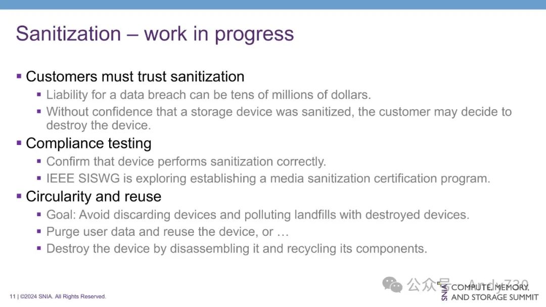 另一个正在进行的工作是围绕合规性测试的。这是因为客户必须能够信任销毁过程。例如,如果他们不相信存储设备已经被彻底销毁,那么数据泄露的责任可能高达数千万美元,而且可能存在方法无效或执行错误的情况。客户可能会选择简单地销毁整个设备,这无疑是一种浪费。我们正在探索的一种方法是建立合规性测试机制,换句话说,就是确认设备是否正确执行了销毁操作。