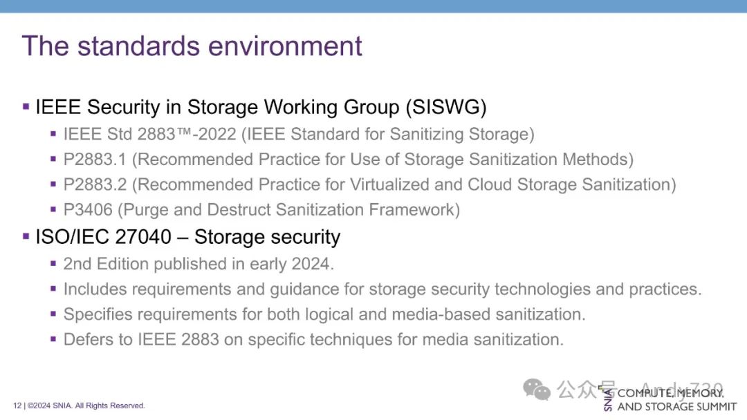 在标准环境方面,我提到了IEEE安全和存储工作组及其所处理的标准。ISO/IEC 27040最近获得了第二版的批准,并与IEEE 2883有所关联,它依赖于2883。