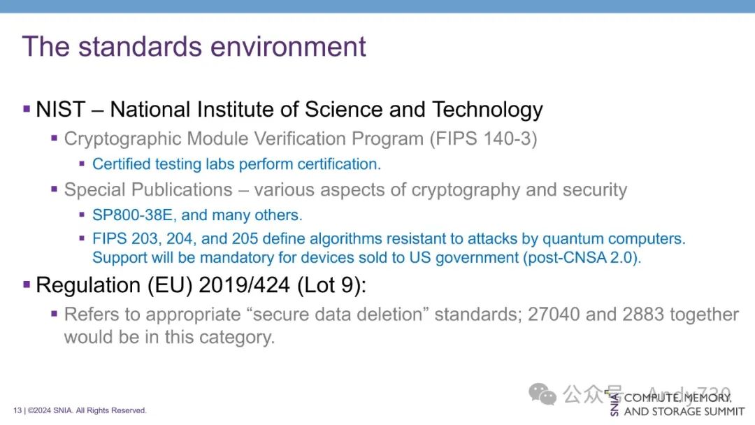 NIST也提供了许多标准,其中包括由FIPS定义的加密模块验证程序。最后,欧盟的2019/424号法规,通常被称为Lot 9,现在可以同时参考27040和2883。