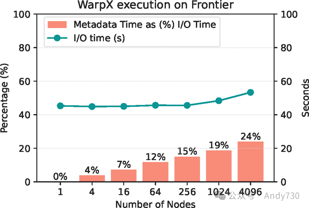 为了挑战这一观点,我们引入了图1的性能基准,该图展示了WarpX在不同规模下的I/O特性(在Frontier上测得)。具体来说,这张图不仅显示了总体I/O时间(绿线,右侧刻度),还清晰地展示了元数据收集时间在I/O时间中的相对占比(以橙色条形表示的百分比)。随着计算规模的增加,每个Rank的I/O时间保持相对稳定,而ADIOS从所有CPU Rank写入数据。然而,ADIOS的元数据收集和写入时间却显著增长,其占比甚至高达总I/O时间的24%。这种趋势不仅局限于WarpX,还同样适用于其他元数据密集型应用程序,如E3SM。