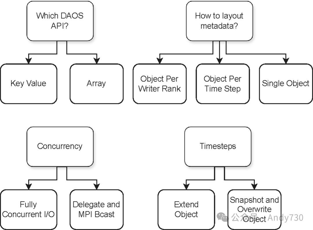 尽管DAOS的键值(KV)和数组接口提供了简洁的接口,但关于如何使用和配置它们存在许多不同的选项。选择最适合给定API并能有效提供最佳端到端性能的选项并不简单。因此,为了充分利用DAOS的KV或基于数组的接口,需要在几个维度上仔细考虑设计空间,如图4所总结。
