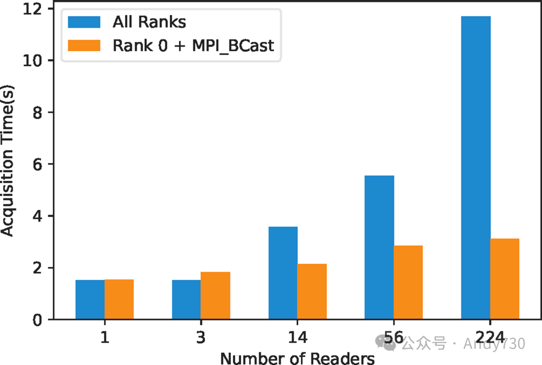 图5:比较使用DAOS KV实现的“每个Rank读取”与“Rank 0读取 + MPI_Bcast”方法的性能(注意:总元数据量保持不变,尽管读取Rank数量增加)