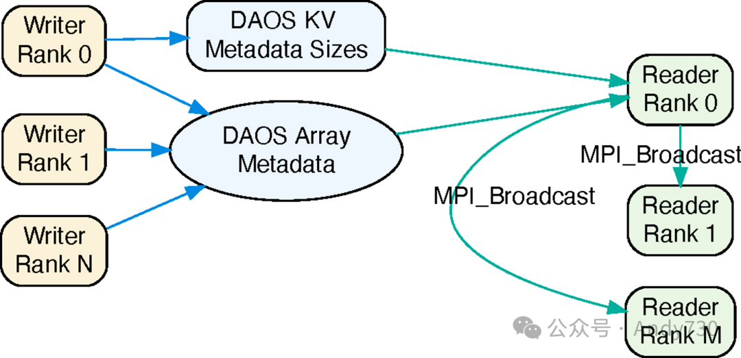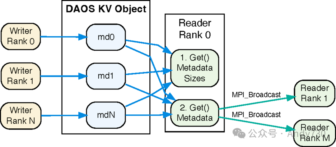 在读取端,排名0首先从KV对象中检索list_metadata_sizes来计算总元数据大小。在分配了必要的内存后,它会使用daos_array_read()函数从DAOS数组中读取所有写入者的元数据。随后,这些元数据会被广播给所有其他读取者排名。