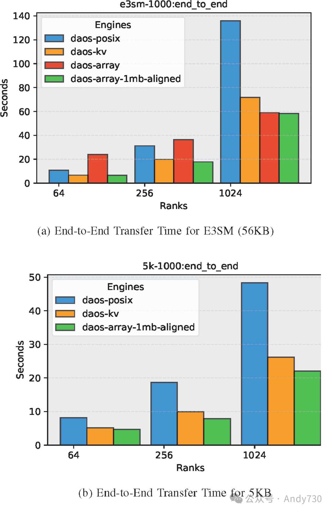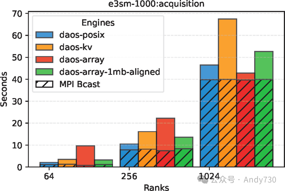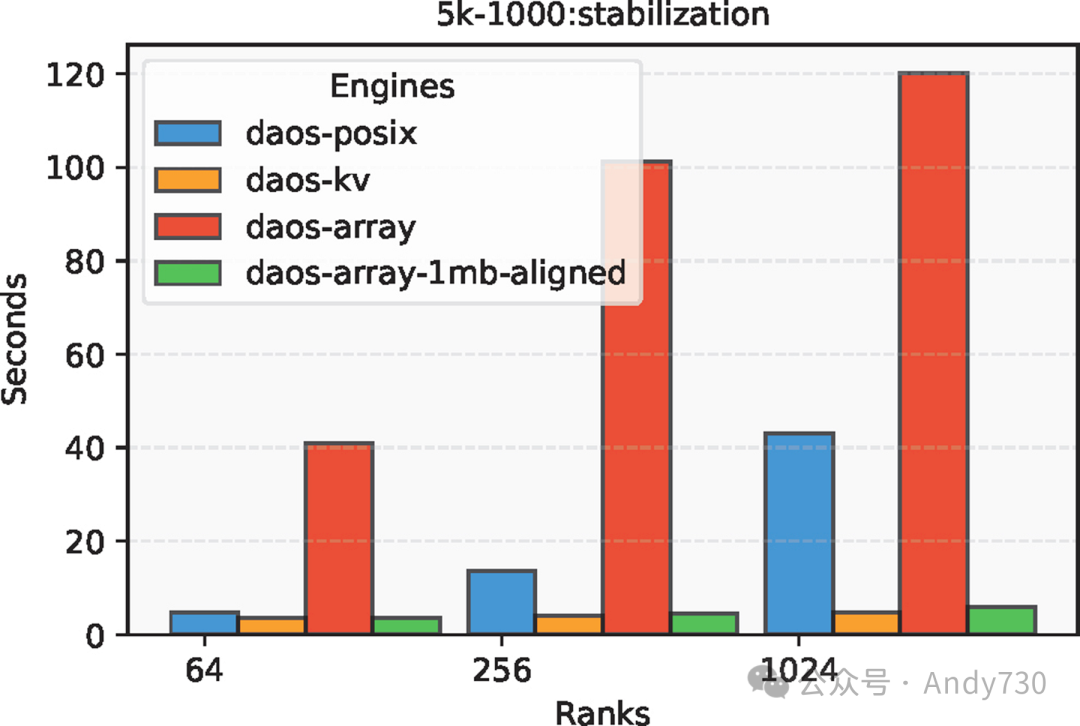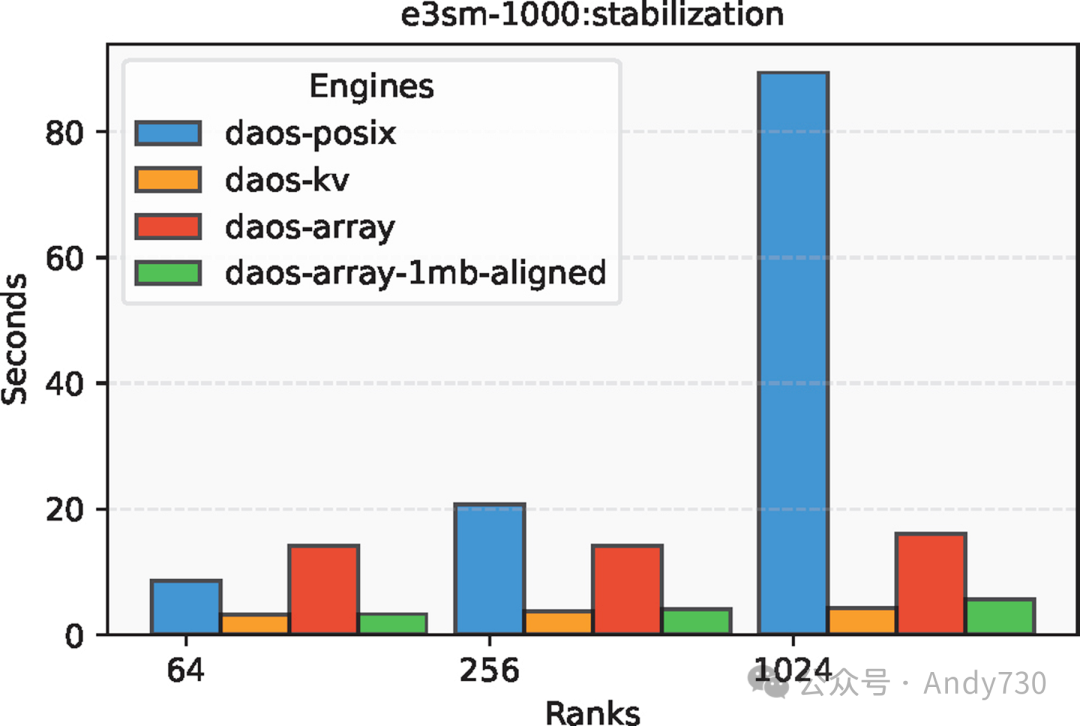 图8:E3SM中不同DAOS引擎在56KB元数据下的稳定时间对比