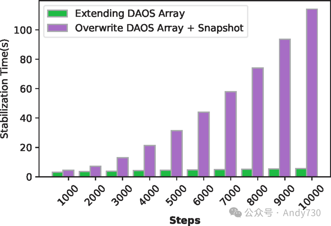 回到图10,DAOS-Array-ChunkSize-aligned引擎有效地解决了元数据分布不均的问题。它通过优化元数据在目标间的分布,显著减少了资源竞争。因此,DAOS-Array-ChunkSize-aligned的稳定时间得到了大幅提升,比DAOS-Array快了25倍,与DAOS-KV相当。