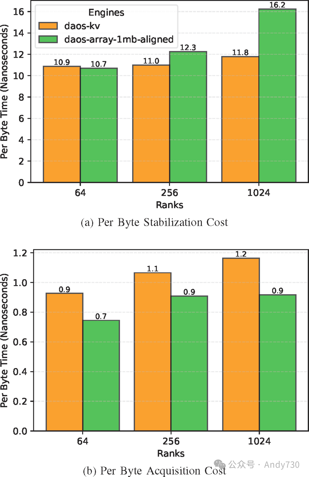 图16:使用每字节成本测量,随着Rank数量增加的DAOS引擎稳定性和获取效率(E3SM 56KB元数据)