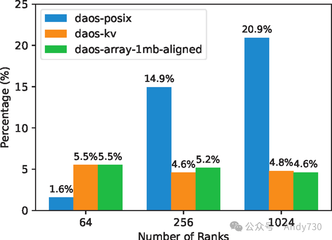 为了评估DAOS元数据引擎在完整应用中的性能,我们运行了WarpX激光尾波场模拟,进行了1000次迭代,每10次迭代写入一次ADIOS数据输出。模拟设置包括128 x 128 x 256单元的离散网格,采用了自适应网格细化(AMR)和最大网格尺寸以及16的分块因子,以优化计算效率。图17显示了稳定化时间占执行时间的百分比。这次WarpX执行的元数据大小为几KB,这些结果与图10中5KB稳定化的性能趋势相似。在此情况下,WarpX在Cambridge CS3D机器上执行,因此绝对测量值与图1中ORNL的Frontier的结果不直接可比。然而,对于1024的基线DAOS-POSIX测量值,也约占总体I/O时间的21%。而对于DAOS-KV-async-get和DAOS-Array-ChunkSize-aligned,这一时间降至约4.5%。这证实了合理使用DAOS接口可以显著降低元数据I/O成本。