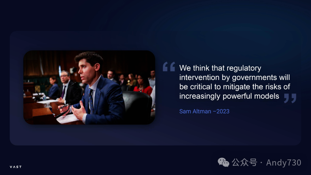 当我们探讨生成式AI所处的阶段时,很明显的一点是,随着生成式AI日益受到公众关注,模型开发初期的一些实践做法将不得不做出改变。一个典型的例子是,去年春天,Sam Altman在国会上的演讲,引发了广泛讨论,这些讨论涉及该技术的潜力,以及政府监管如何真正有助于控制市场,并帮助消费者和用户建立并增强对生成式AI的信任。随着模型功能日益强大,对其应用的控制也愈发重要。