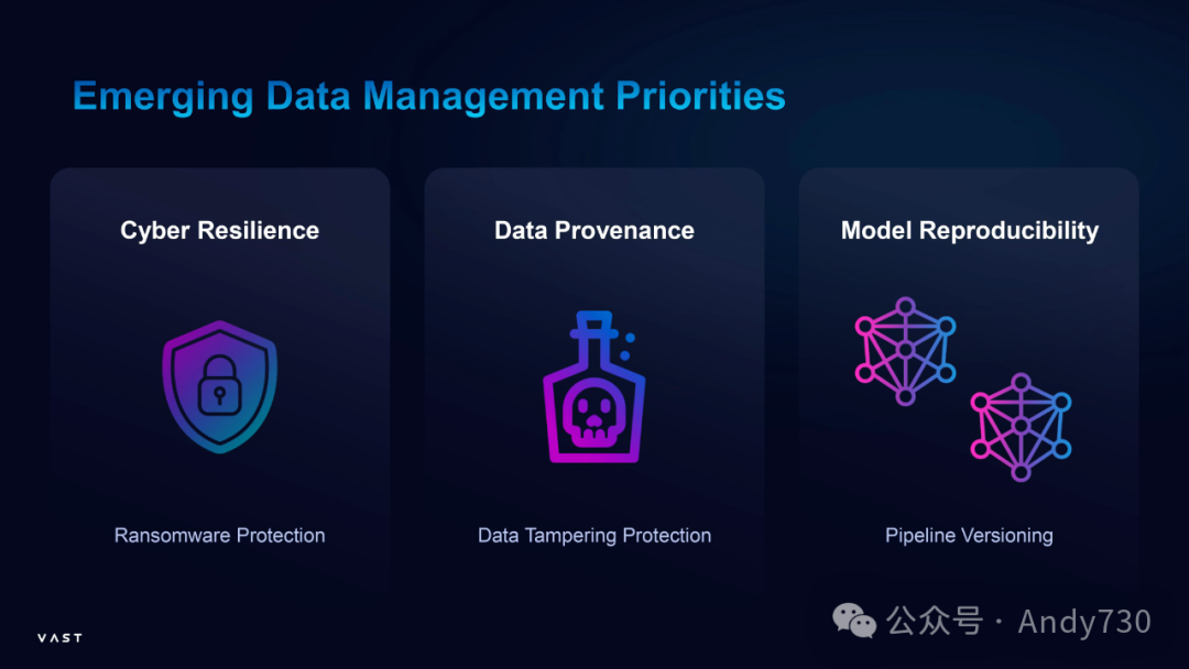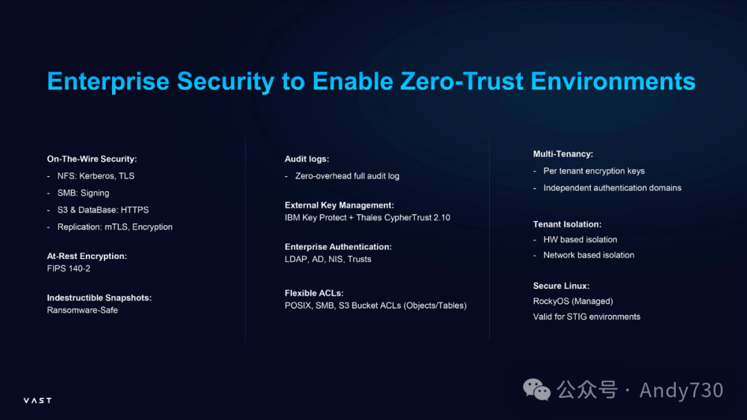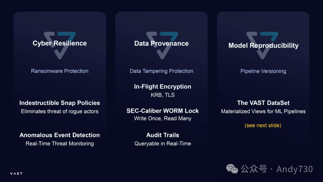 当我们回顾今年的进展时,我们发现这些努力与VAST Data Platform的一些功能高度契合。网络安全性得到了保障,因为我们有异常检测功能,并能支持防篡改的快照,使其无法被恶意行为者破坏。数据血缘(Data lineage)得到了清晰记录,这得益于我们的数据篡改保护和监控(data tampering protection and monitoring)机制。在数据传输过程中,我们提供了加密保护。我们还具备高级别的蠕虫锁定保护机制,确保文件内容不被非法篡改。此外,我们还有审计跟踪功能,可以随时查看数据的所有操作。