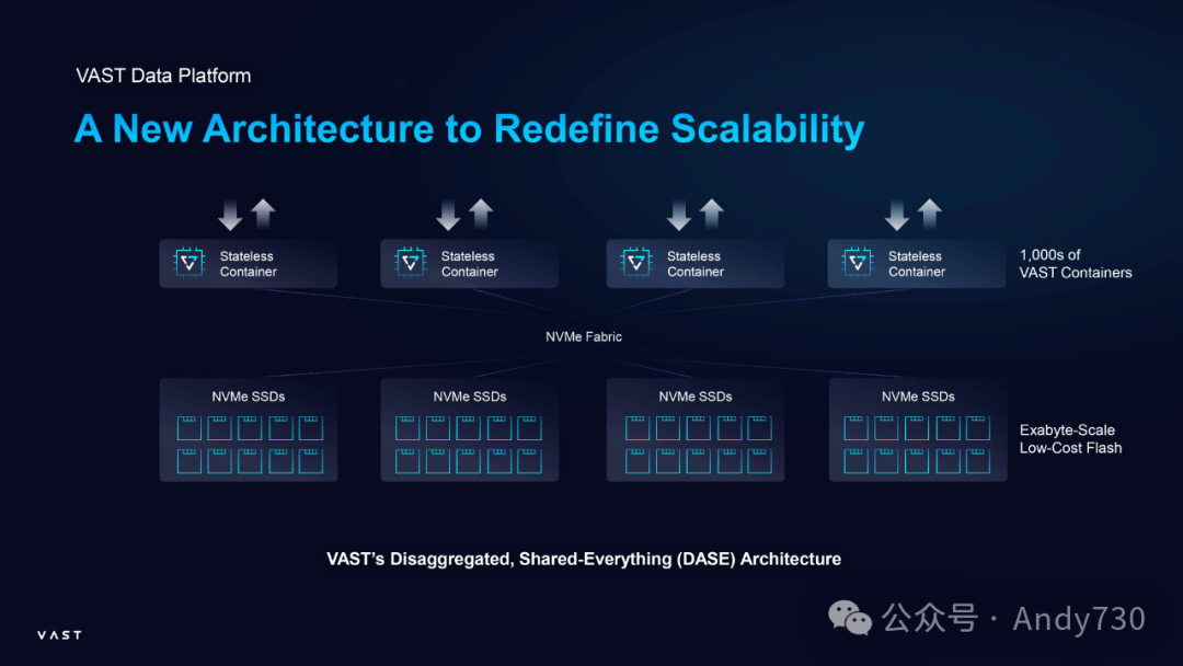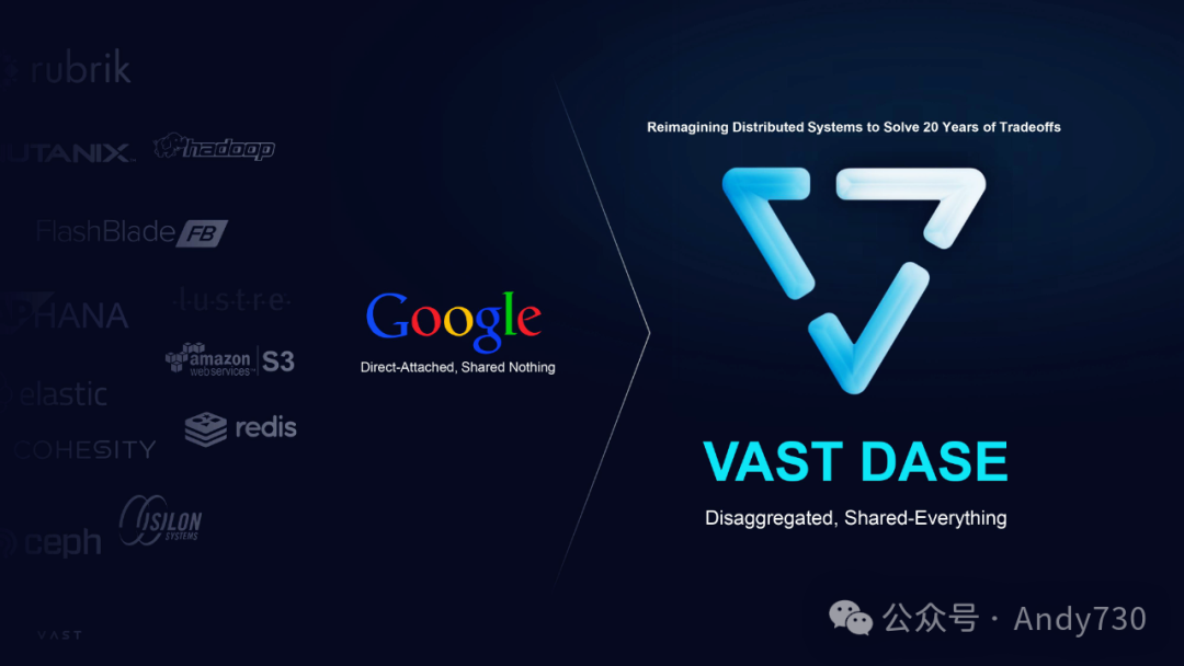 当时间推进到2016年,也就是我们开始VAST项目的那一年,我们发现了构建全新分布式系统的机会。我们希望能够重新构想这一领域,并克服Google在奠定这一变革性概念时所做的20年妥协所带来的限制。我们称之为DASE,即Disaggregated And Shared Everything(分离式共享一切)。