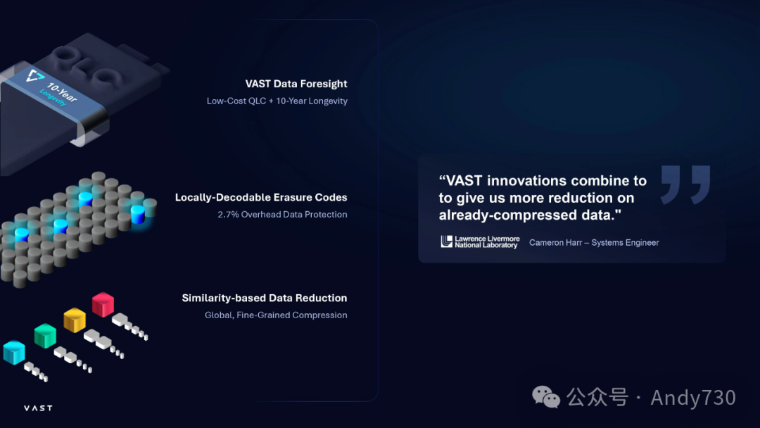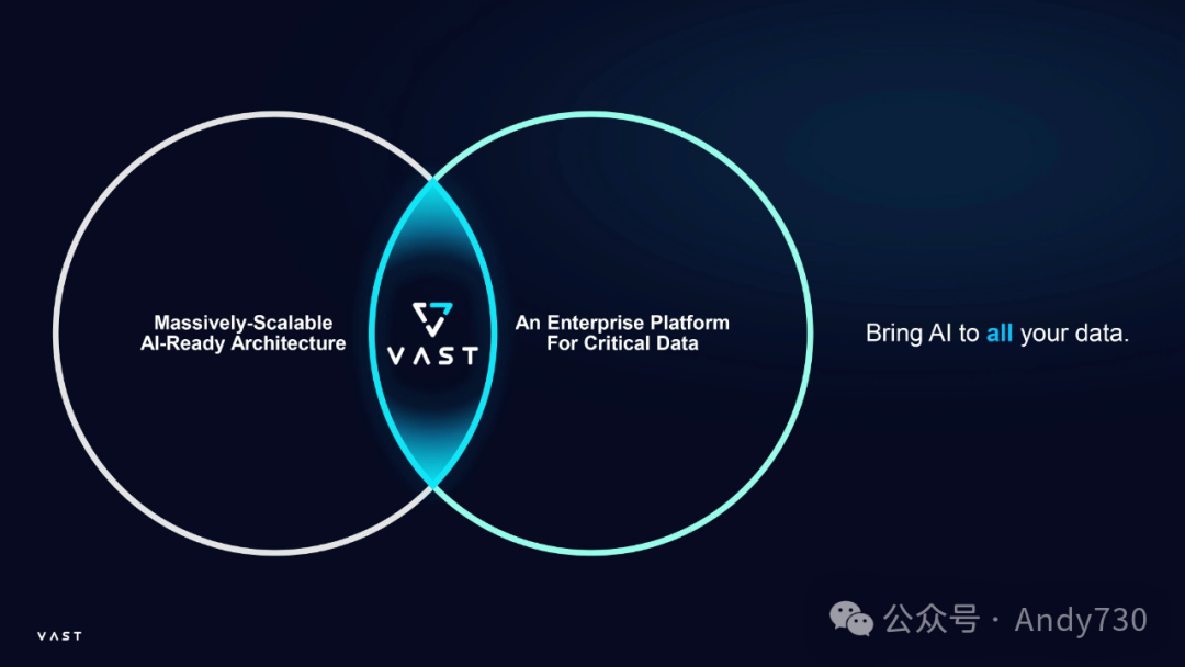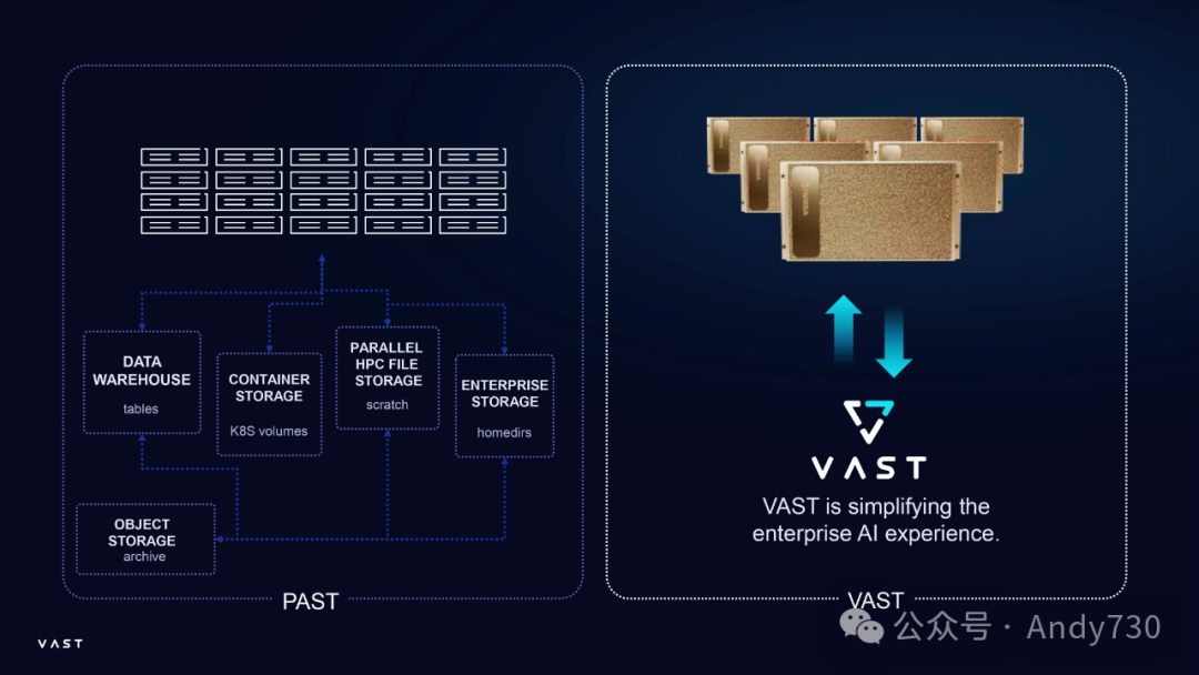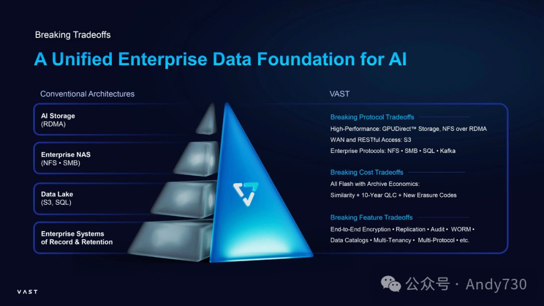 从成本效益和规模的角度来看,我们构建了一个可扩展至归档级别的系统,并构建专门处理不同风格数据管理和访问需求的数据基础设施层。这始于统一所有协议,并进一步统一所有层级。最终,我们推出的是一个不需要客户在性能与企业级别易用性之间进行权衡的平台。通过使用VAST,客户可以同时享受到这两者的优势。