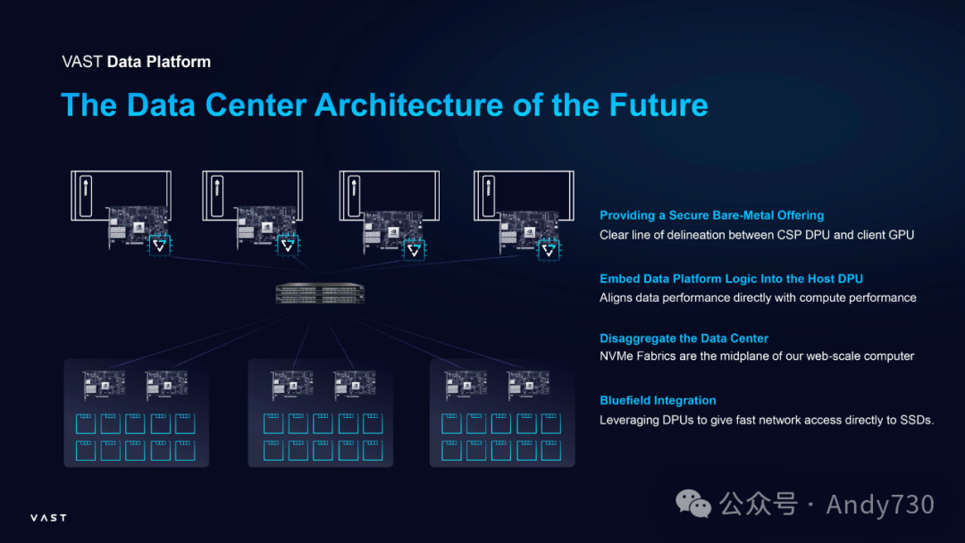 与BlueField方案相关的另一个要点是,从历史上看,将存储服务放入主机对于需要在多租户环境中强制执行零信任的云存储服务商来说显然不可行。但我们平台的优势在于,我们不会引入主机中的并行文件系统客户端。相反,我们仅使用NFS,而NFS在提供和读取文件时对底层存储基础设施一无所知。同样,S3和SQL客户端也具备这种无感知性。使用VAST Data Platform的各种服务时,客户端或应用程序访问无需了解存储层面发生的事情,这消除了当今最大的AI云服务商面临的主要安全威胁。