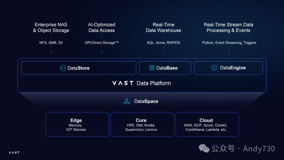 VAST DataSpace则代表了我们在跨越多个地理区域、不同云平台和本地数据中心之间的无缝连接能力,以及这些连接中所包含的所有内容。简而言之,这就是VAST Data Platform的核心理念。