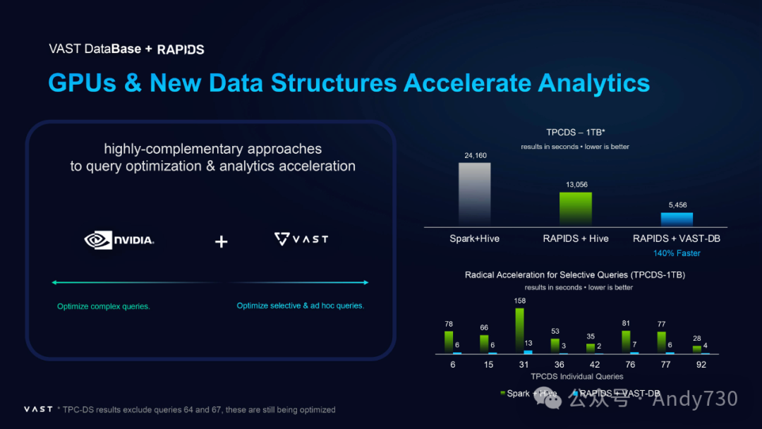谈到Spark,我们与NVIDIA在RAPIDS工具包上进行了深入的合作。这是一个高性能的数据科学工具包,旨在加速Spark应用程序。当思考VAST与NVIDIA在这种情境下的结合时,真正令人惊叹的协同效应便显现了。大家知道到NVIDIA一直在优化复杂查询,但这仅仅是数据科学领域中一个具有挑战性的领域。VAST真正致力于解决的是I/O问题,这是GPU无法直接应对的问题。而我们则更侧重于优化选择性和特定查询。