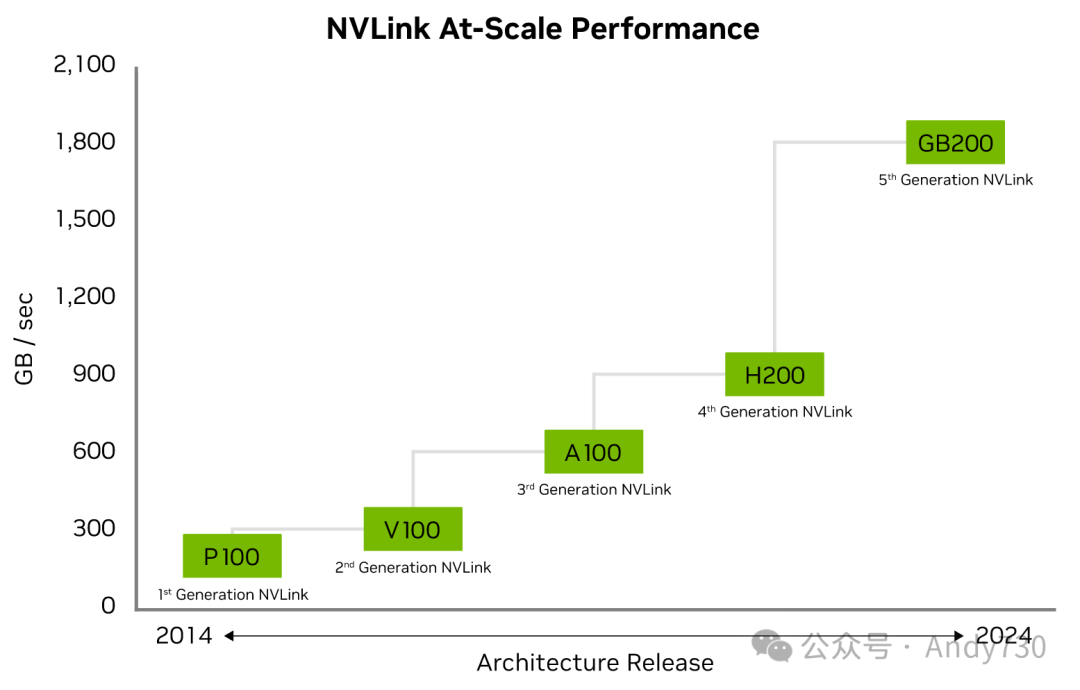 NVLink技术的最新版本——NVLink 5.0,在系统层面上实现了重大进步。该技术的第五代将GPU到GPU再到CPU的总线数据传输速度提升至每秒100GB。每块GPU拥有18个NVLink连接,Blackwell GPU的总带宽可达到1.8TB/秒,这是用于GPU间或与Hopper CPU间数据传输的,带宽是NVLink 4.0的两倍,也是行业标准PCIe Gen5总线带宽的14倍。NVLink是基于NVIDIA的高速信号互连协议NVHS开发的。