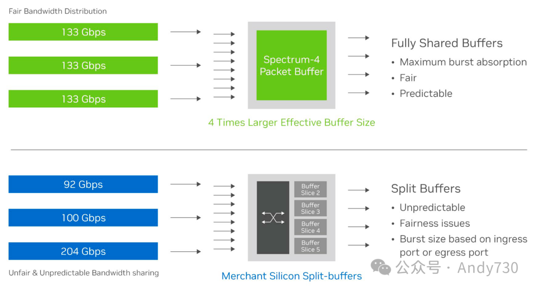 实现性能隔离和防止“近邻干扰”的关键在于采用共享数据包缓冲区。通过为所有作业提供平等的缓存访问权限,共享缓冲区能够确保混合AI云工作负载的稳定性和低延迟。
