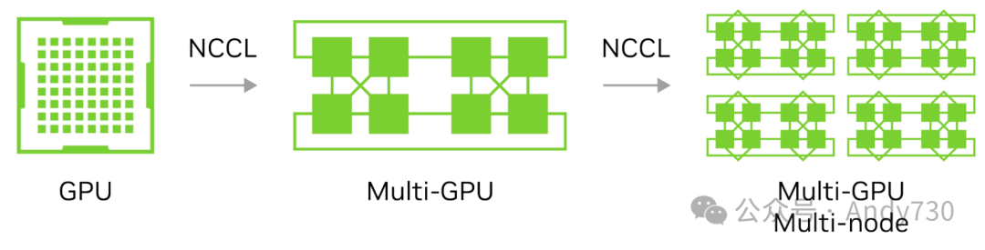 图5:单个GPU,和使用NCCL在多GPU和多节点配置中进行扩展