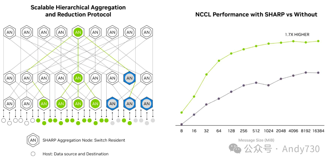 图6:左侧是SHARP的可视化表示,右侧是它与NCCL一起使用时的性能表现