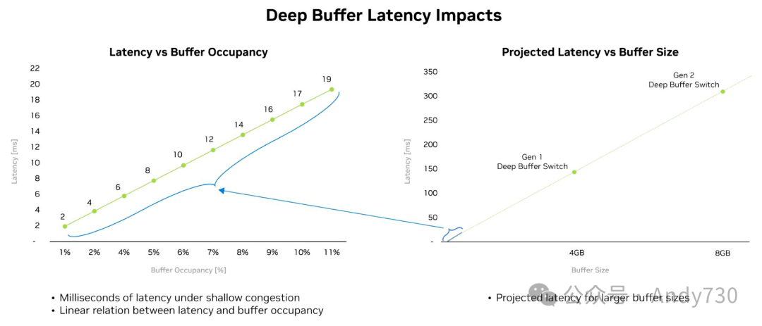 尽管深缓冲区交换机功能丰富,支持数据中心互连(DCI)和电信网络所需的大规模部署,但它们并未针对AI网络进行优化。深缓冲区交换机固然能够容纳更多的数据流量,对微小的突发流量也不甚敏感,但更大的数据容量往往伴随着更高的尾延迟,进而增加了平均延迟和抖动。这一特点对于依赖最坏情况延迟的AI工作负载来说尤为不利,可能导致任务完成时间延长,训练周期增长。