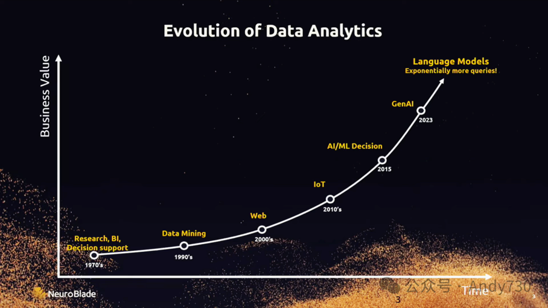 在过去的几年里,大数据分析或分析型数据库备受瞩目,这让我们稍感惊讶。因为SQL自上世纪70年代以来便一直存在,起初主要用于研究和商业决策支持。随着数据量的不断增长,数据挖掘逐渐成为热门话题。进入2000年后,互联网的迅猛发展以及物联网的兴起,使我们能够收集到更多数据。这些数据被用于分析客户行为和人们的行为模式,以便更精准地投放广告、提高收入。同时,我们也试图通过理解这些行为来改善世界。这推动了人工智能和机器学习时代的到来。我们开始构建各种模型,并输入更多数据进行管理。最终,生成式AI的兴起引发了新一轮的数据爆炸。