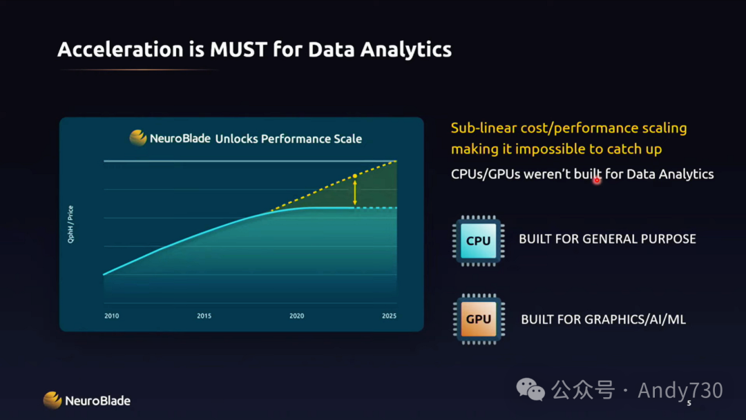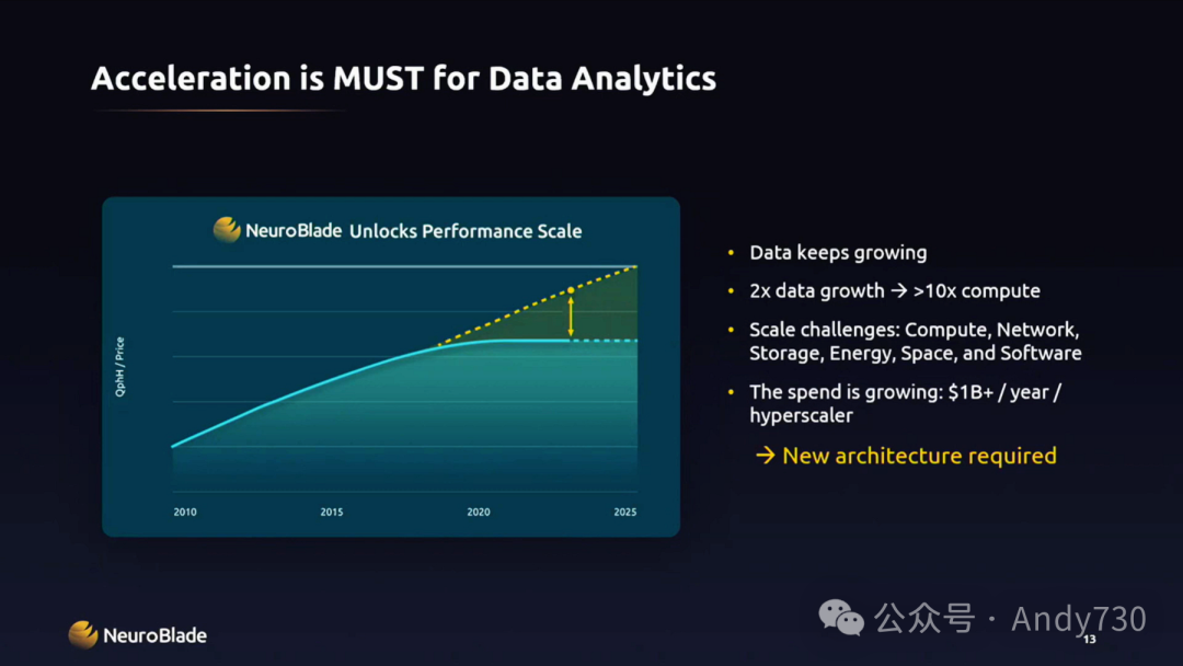 关于数据分析领域的一些情况,我可以简单地举个例子来说明。当我们在2018年创立NeuroBlade时,我们怀揣着一个宏伟的创业理念,那就是成为数据领域的英伟达(Nvidia)。随着时间的推移,我们逐渐明确了我们的目标,那就是加速数据分析。在与众多大型超大规模公司、大型银行以及大型制药公司的交流中,我们了解到他们都面临着加速SQL查询或快速查找的难题。