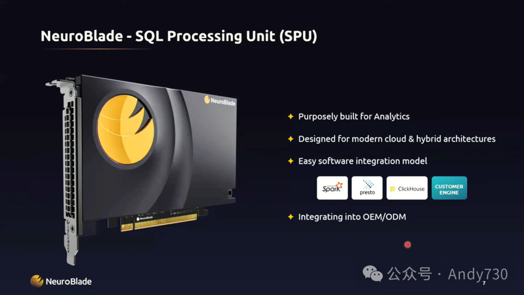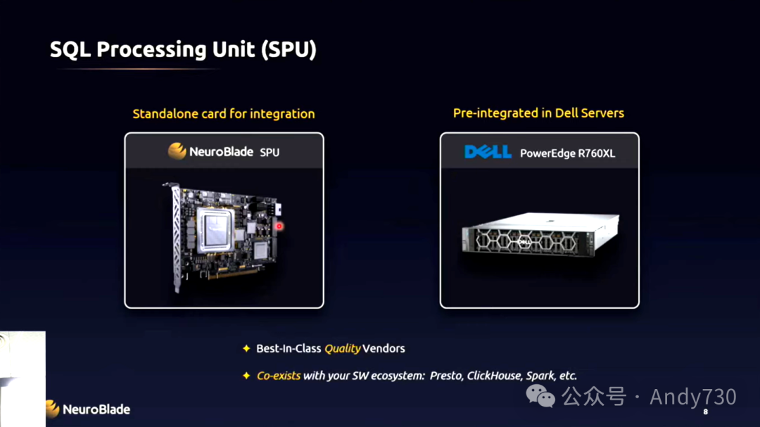 再来说说我们的SPU。我们花费了近六年的时间来设计它,以确保它完全适应现代的云环境架构。SPU是专为分布式存储和计算而设计的,这一点从我们目前所支持和加速的引擎中便可见一斑。