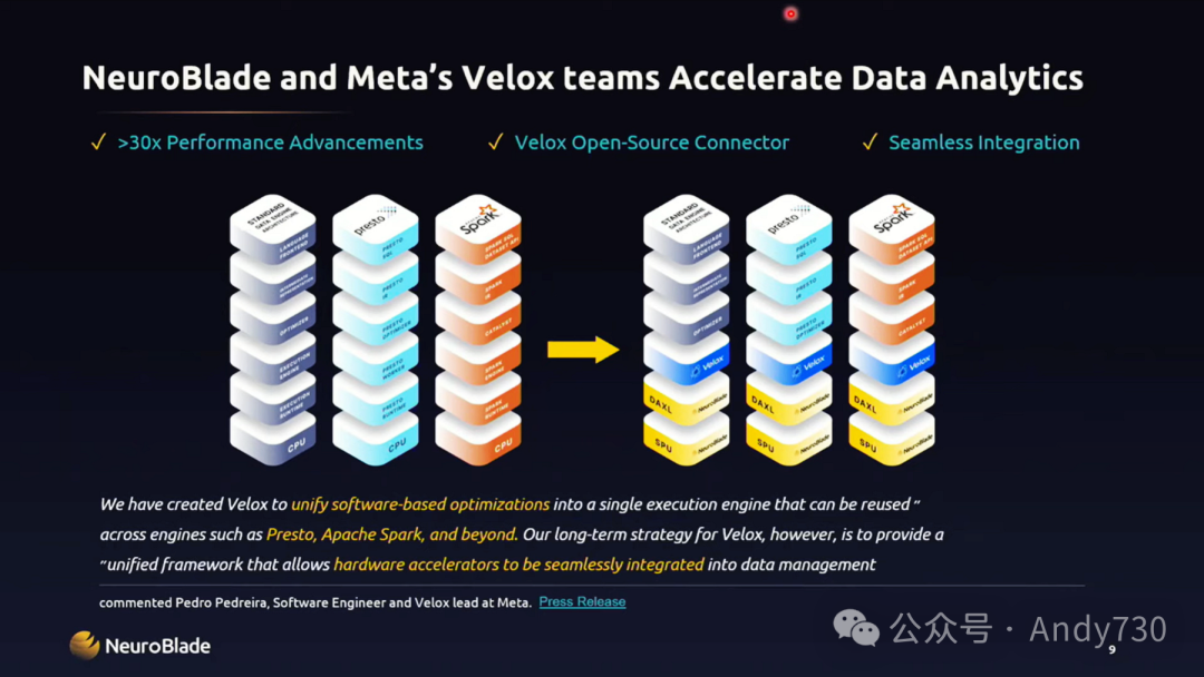 我来分享一下我们去年公开的一些合作成果。我们与MAA的Velo团队合作,针对Velux进行了加速优化,主要通过加速Presto和Spark,我们取得了超过30倍的加速效果。稍后Krishna会进一步深入探讨生态系统、各种数据格式以及我们如何集成到现有标准环境中的更多细节。