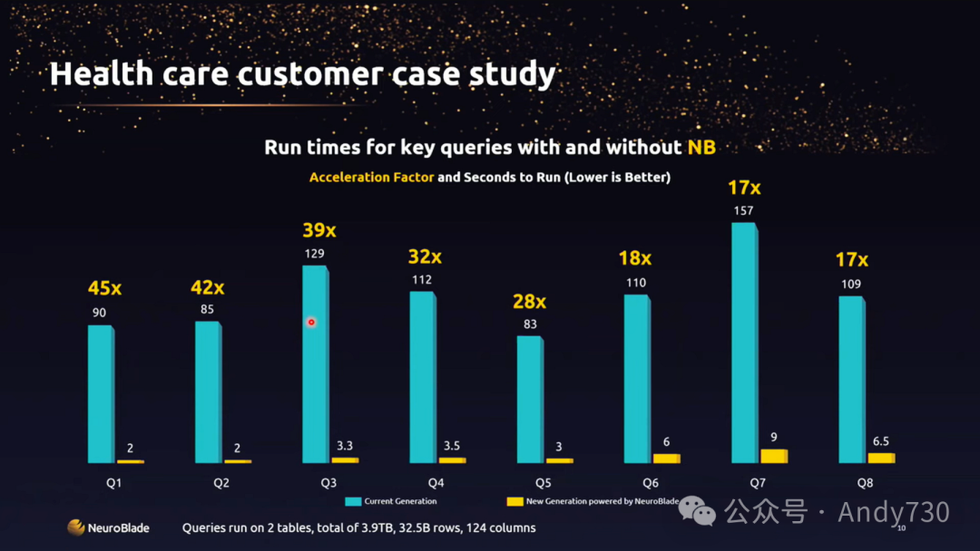 这里我想特别提到一个有意思的结果。在医疗保健领域,我们有一个客户拥有大量记录,他们建立了一个系统,允许用户连接系统并对数据进行查询。在他们使用现有的一代技术时,你可以看到真实查询客户数据的运行时间在一分钟到三分钟之间。这意味着用户发出查询后,需要离开一会儿,比如去喝杯咖啡,再回来查看结果,而结果可能还没出来。但是,通过引入NeuroBlade的技术,即使是在最耗时的查询中,用户也能即刻得到结果,完全不需要离开座位,查询过程仅需几秒钟。这极大地改变了用户的工作方式,提高了工作效率。甚至可以说,我们除了为用户节省时间外,还在某种程度上优化了他们的咖啡消费量,因为他们不再需要频繁地离开座位去喝咖啡了。