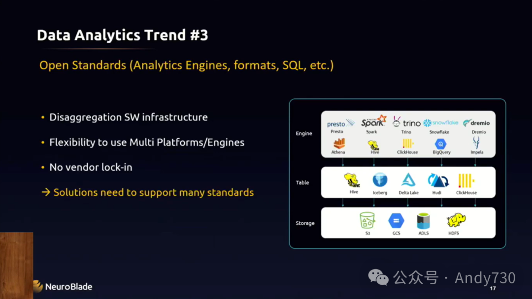 另一个趋势也促使我们加大了投入,那就是数据分析和格式的开放标准。在软件基础设施层,软件正在逐渐实现解耦。因此,不同的查询引擎可以支持不同的表格格式或文件格式,并期望能在不同的存储解决方案上运行。这为客户提供了灵活性,使他们能够利用各个领域的最佳解决方案,并选择最适合其存储中表格格式的查询引擎,从而无需担心供应商锁定问题。这对于客户和所有提供解决方案的参与者来说都是非常理想的,无论是软件解决方案、硬件解决方案,还是二者的组合。我们需要支持所有这些格式,这也是我们讨论的焦点。我们首先会考虑哪些客户,然后再跟进哪些客户。通常是首批采用者客户,他们愿意接受新事物,并在此基础上进行开发、测试,并帮助我们确保产品最适合他们的业务领域。