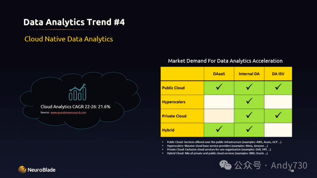 这个趋势是云端数据分析的增长。云端数据分析正在迅速崛起,因此我们需要与客户建立联系,可能会作为他们数据分析服务的一部分出现在公有云中。为此,我们需要与他们的数据分析服务团队合作。当然,他们也在内部进行数据分析,所以我们还需要与这个内部团队保持合作。此外,他们还有服务提供商为其提供数据分析解决方案,我们也需要与这些服务提供商建立联系。因此,这是一个涉及多个方面的讨论,实际上不仅仅是三个方面,因为我们还需要与基础架构团队沟通,确保我们的卡可以集成到他们的基础架构中。同时,我们还需要确保最终用户,无论是数据分析服务的用户还是内部数据分析的用户,都能充分利用我们的软件。