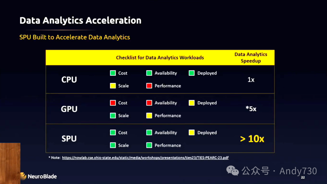 我们观察到了这样的市场趋势,并尝试提出一个解决方案,以帮助客户实现扩展,同时避免成本激增。因此,我们设计了一种加速器,我们将其称为SPU。这个名称与市场上的xPU命名趋势保持一致。SPU是专门为数据分析而设计的,我们并没有采用为其它任务构建的硬件或计算芯片,然后再尝试通过软件解决方案来最大化其性能。相反,SPU是从头开始,针对数据分析和客户面临的挑战进行设计的。