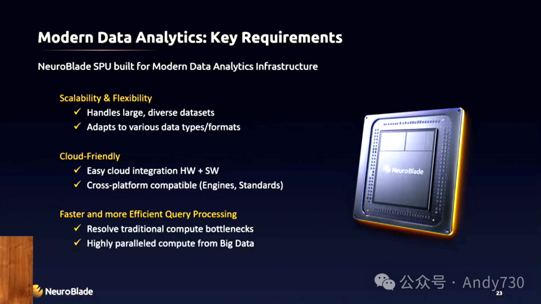 Mordechai Blaunstein讨论了在大数据分析领域中数据分析加速的关键需求。通过展示NeuroBlade的SQL处理单元(SPU),展示了其提高大数据处理速度和规模的效果。与会者可以深入了解定义大数据分析格局的最新趋势,包括数据湖架构和开放标准,并了解NeuroBlade如何满足数据中心对快速数据分析加速的需求。